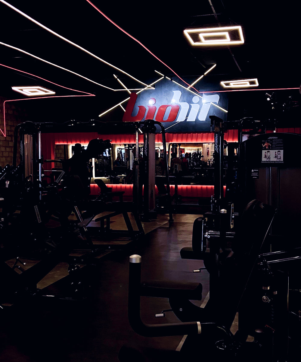 Descubra uma nova perspectiva de treinamento com a iluminação inovadora da Academia BioHit. Com luzes vibrantes que motivam e energizam cada movimento.
