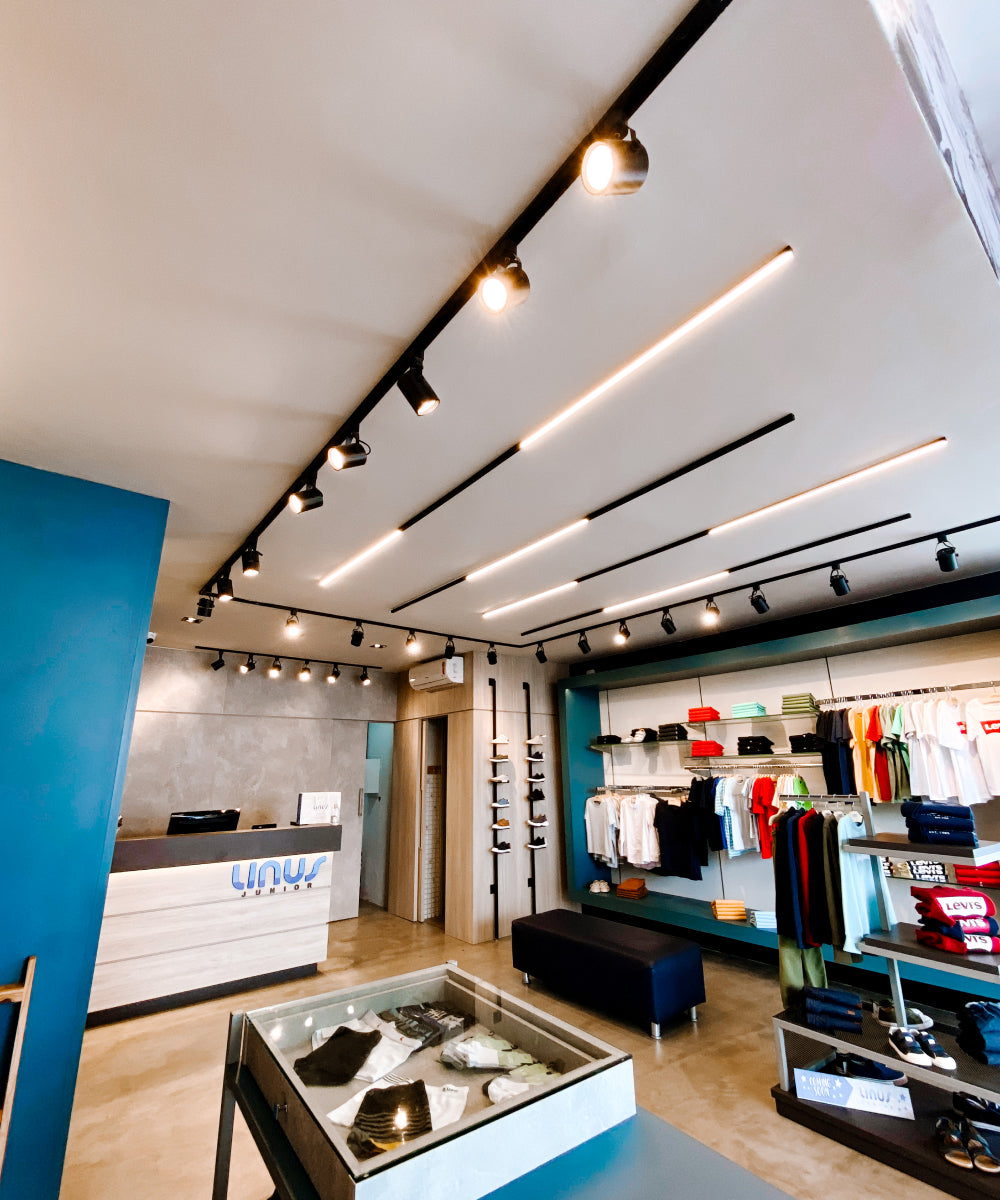 Iluminação projetada para destacar os produtos nas prateleiras mesclando com pontos indiretos para iluminação do espaço.